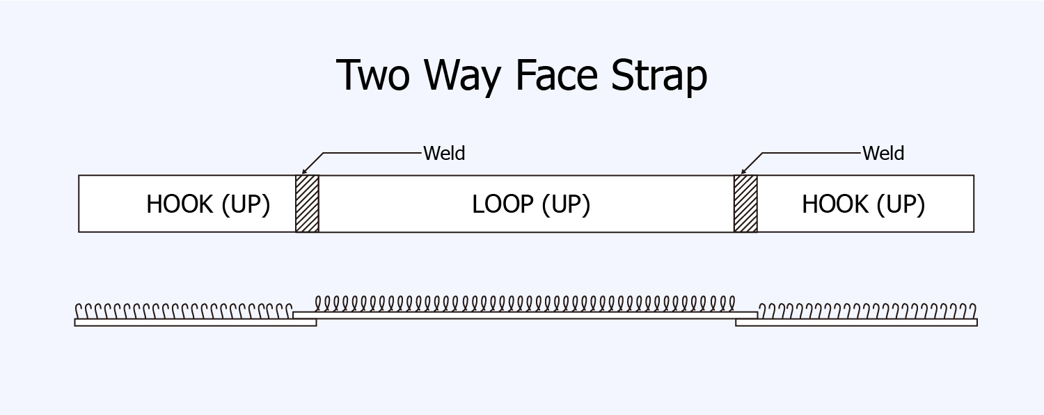 固定帶(勾毛同向兩端接合)由黏扣帶之勾面及毛面所組成,在毛面黏扣帶的兩端分別接合勾面黏扣,適用於固定或調整用途,如環繞式護具固定、雙肩後背式背包肩帶固定調整等。